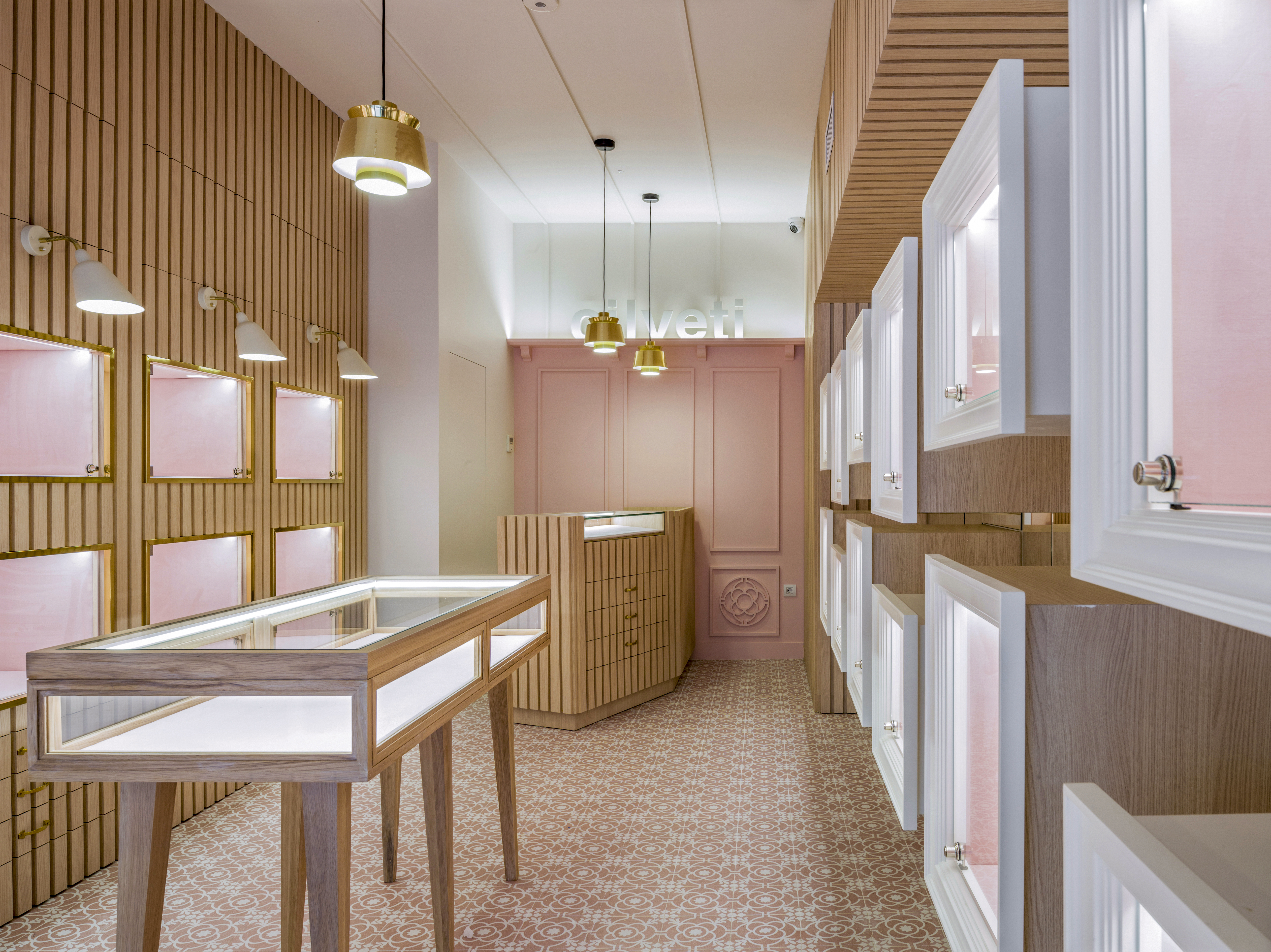 En la bisutería Cilveti una vez se traspasa la puerta, todo evoca a vivir la vida en rosa. Resuenan en la cabeza las primeras notas de la canción francesa de Edith Piaf al entrar al local. No se equivocan, ya que este espacio se respira una atmósfera en la que el actor dominante es este color. Sube Interiorismo ha sabido vincular con maestría este tono con el público femenino.