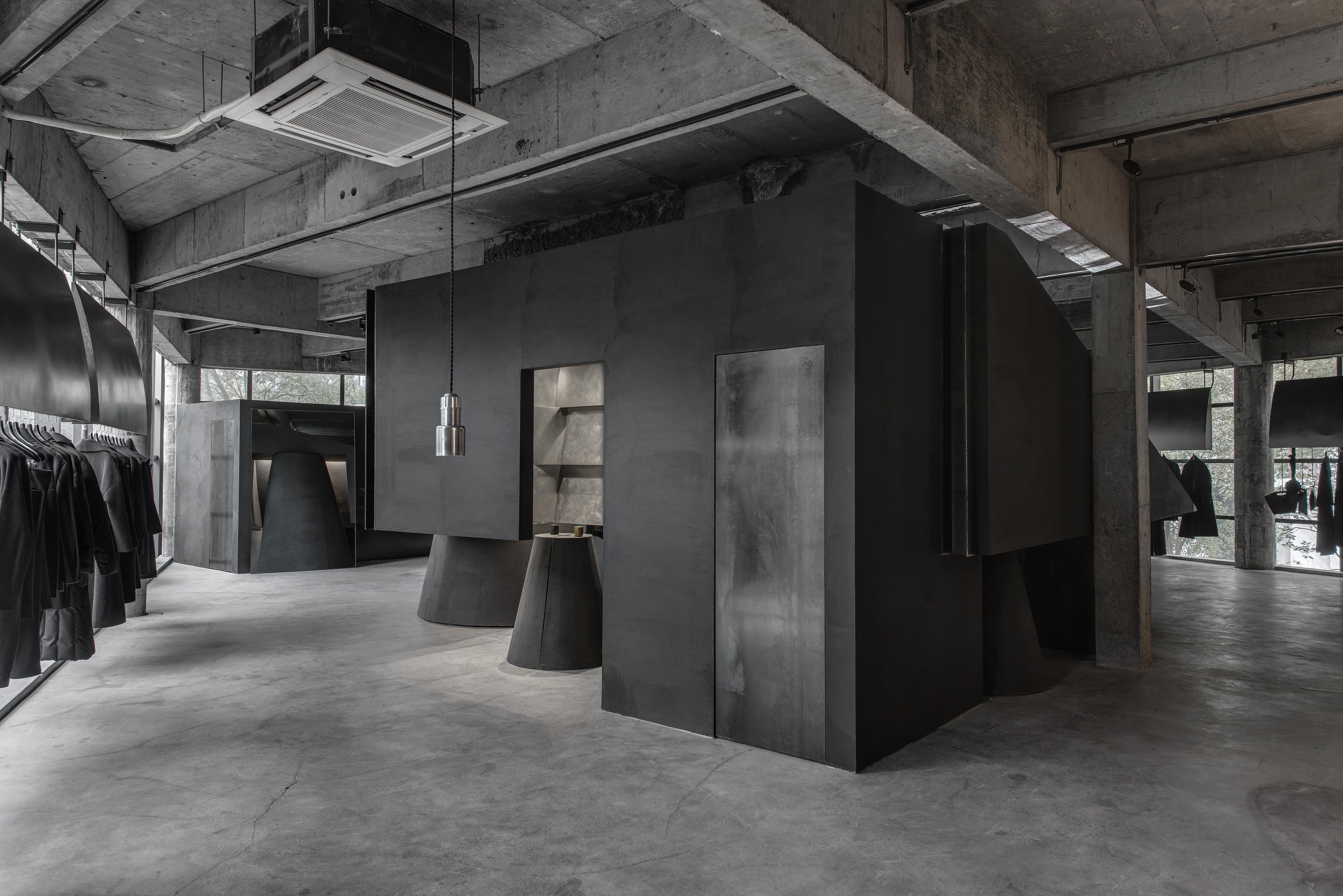 La tienda presenta un look completamente industrial en el que predominan los tonos grises, desde los más oscuros hasta el acero. Una gran escultura con forma de cuña, el Black Cant, da la bienvenida al visitante; pero no es una mera pieza decorativa, pues da acceso a una escalera y alberga la zona del probador.