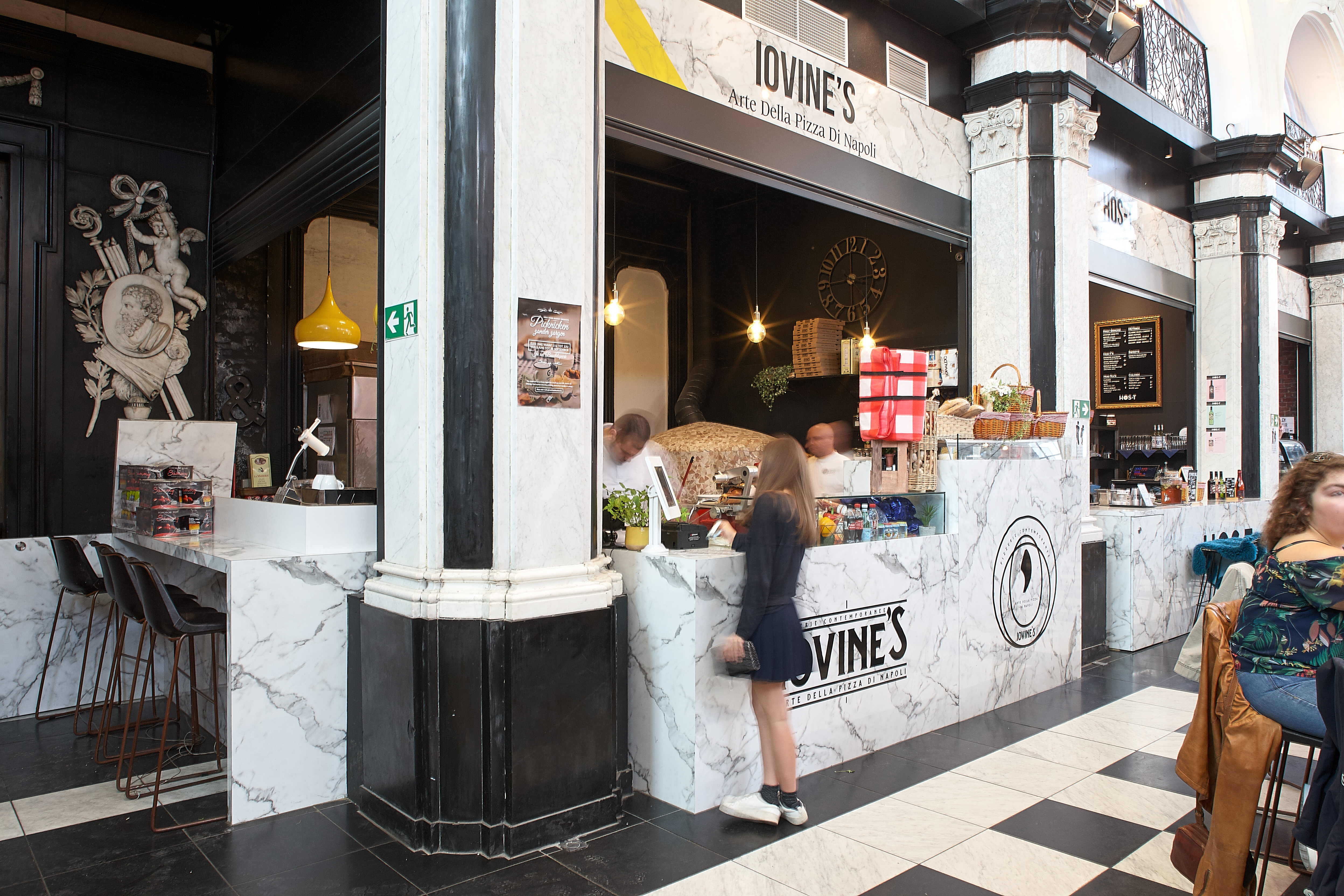 ciones en su mayoría, han optado por el Calacatta Marble de Formica para la planta baja. Con la puesta de sol, Holy Food se convierte