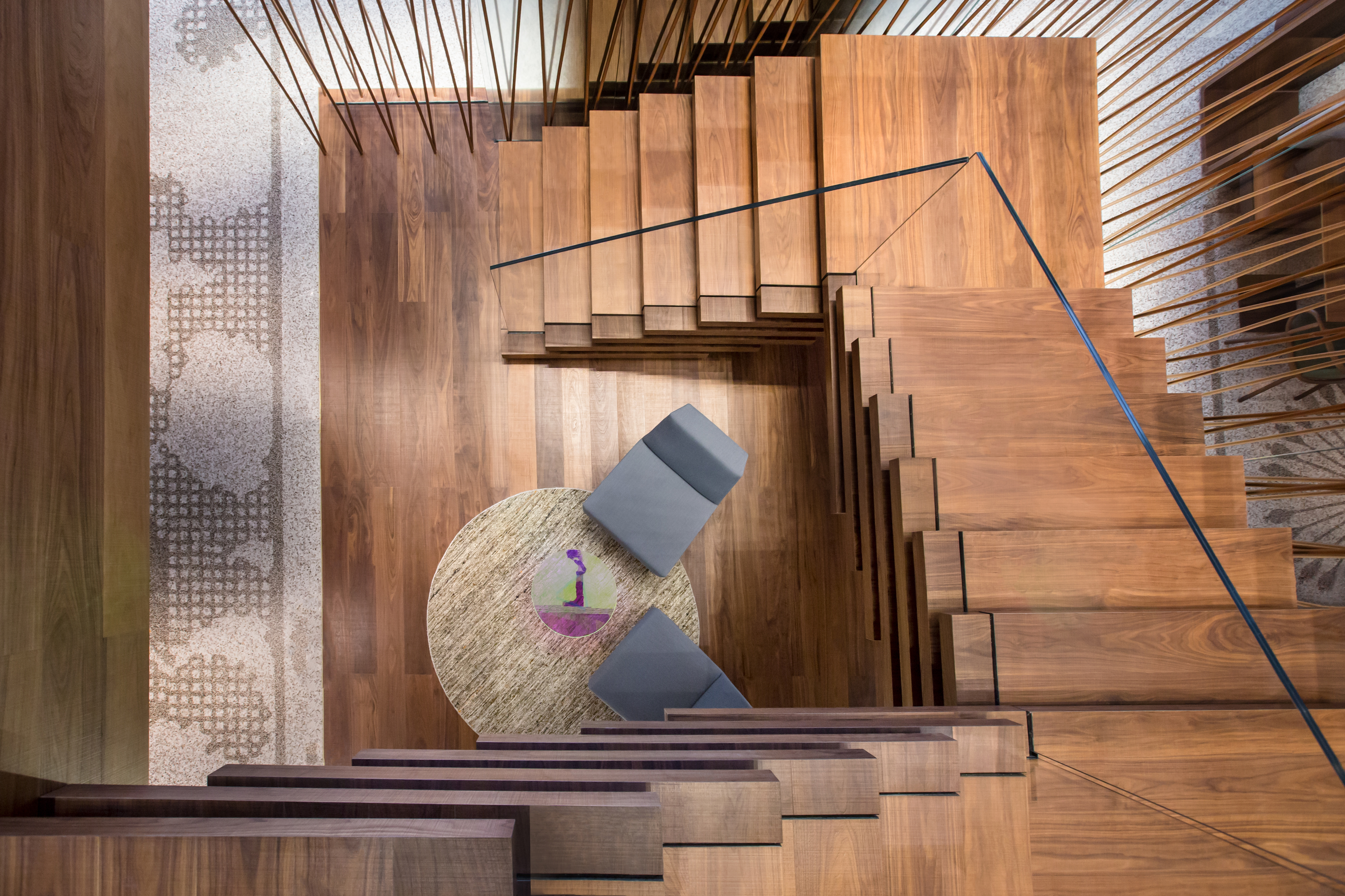 En la región de los grandes lagos de Italia —lugar donde se ubican muchas residencias de famosos— se encuentra el tercero más grande del país, Como. En el Lario, como lo llamaban los romanos, se halla uno de los 25 mejores hoteles del mundo: Il Sereno, que cuenta con 30 suites que tienen impresionantes vistas al paisaje lacustre y a las montañas. La prestigiosa diseñadora Patricia Urquiola se encargó del interiorismo inspirándose en la cultura, el modo de vida y la historia del lago Como para crear una atmósfera que invita al relax y se aleja de los estilos dominantes en la zona: Faux Renaissance y Neoclásico. Uno de los factores clave del hall es la gran escalera volada en acabado nuez Canaletto de la firma Fontanot. El cristal y la madera se fusionan en un único elemento que aporta una visión geométrica, casi escultórica, al espacio.