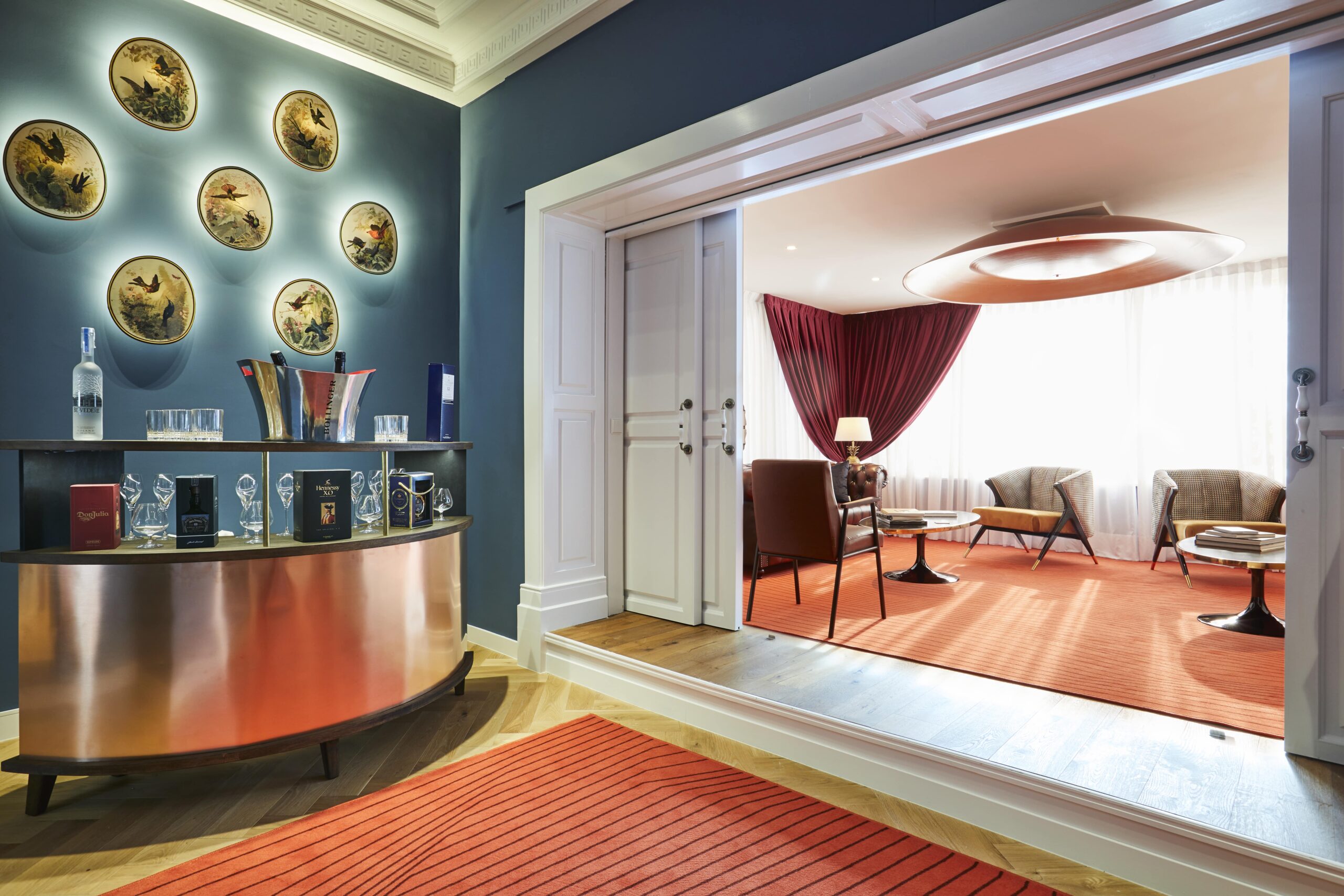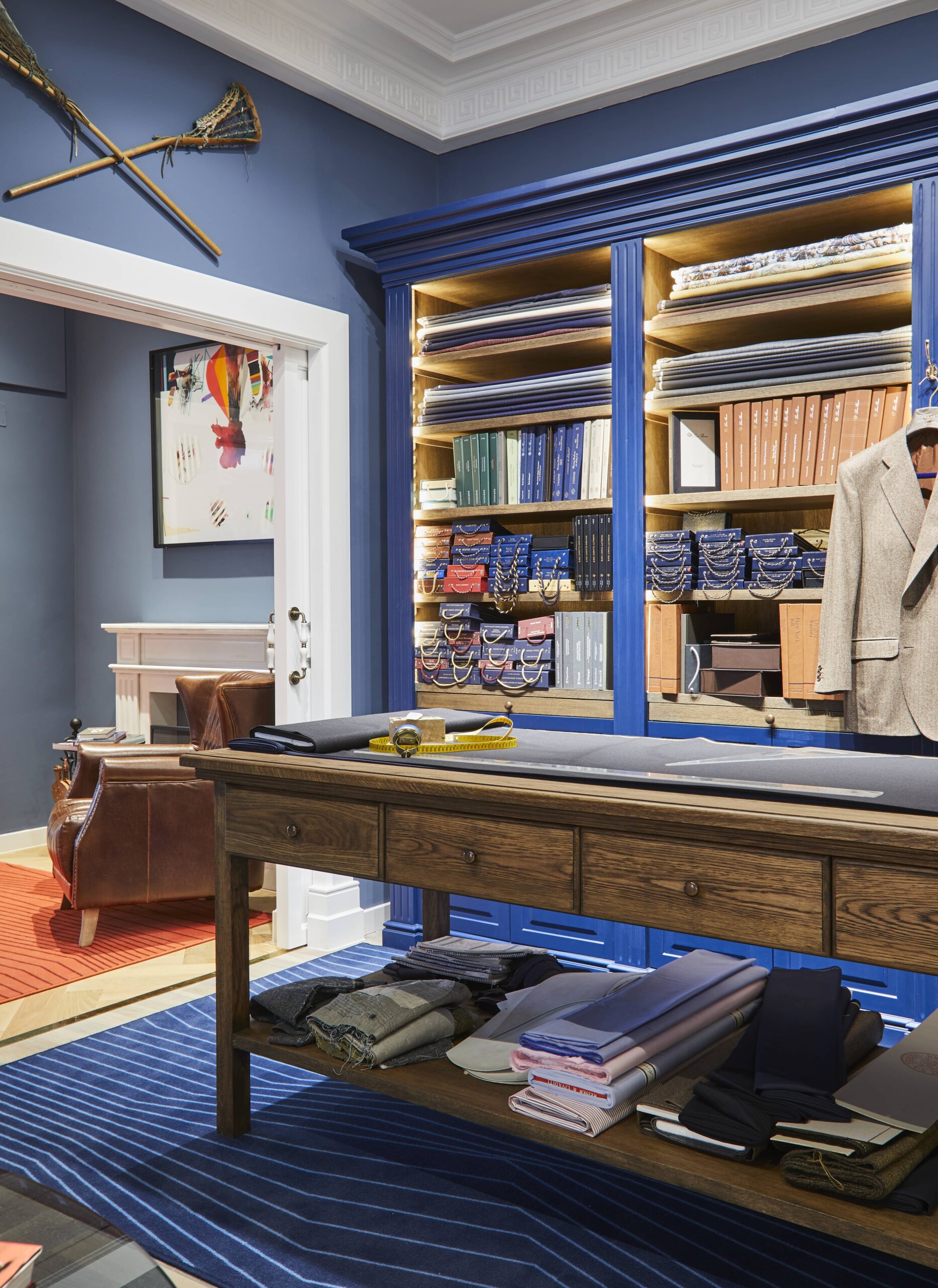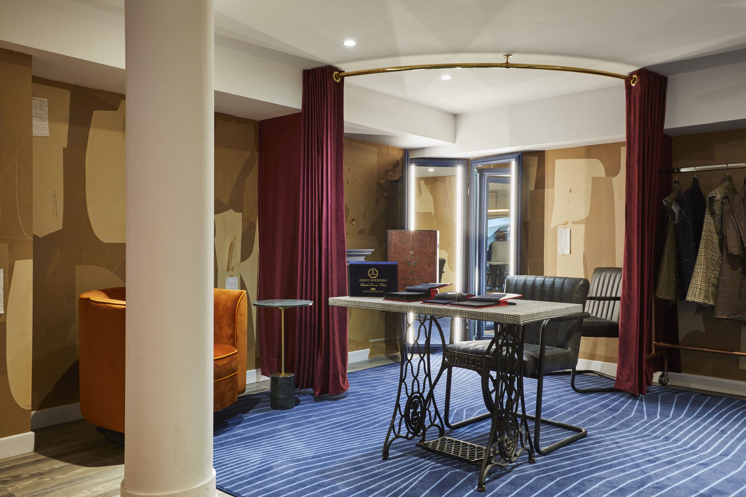 En la primera sala destacan las mesas ovales de exposición y sillas cuyas patas se inspiran a las agujas el sastre. En la segunda, se exponen todos los catálogos de telas y se cortan los patrones sobre las mesas principales, diseño exclusivo de Ilmoidesign. Un gran probador destaca también en este espacio. Al fondo, se ubican dos salas contiguas más, un córner con una selecta barra y otra que alberga la zona de estar para tomar algo mientras se espera. El sótano, por último, es el verdadero corazón del local, donde hay un laboratorio y un gran probador privado. Este espacio está empapelado con auténticos patrones del sastre que Spada y Corbani han querido exponer a modo de trofeo.