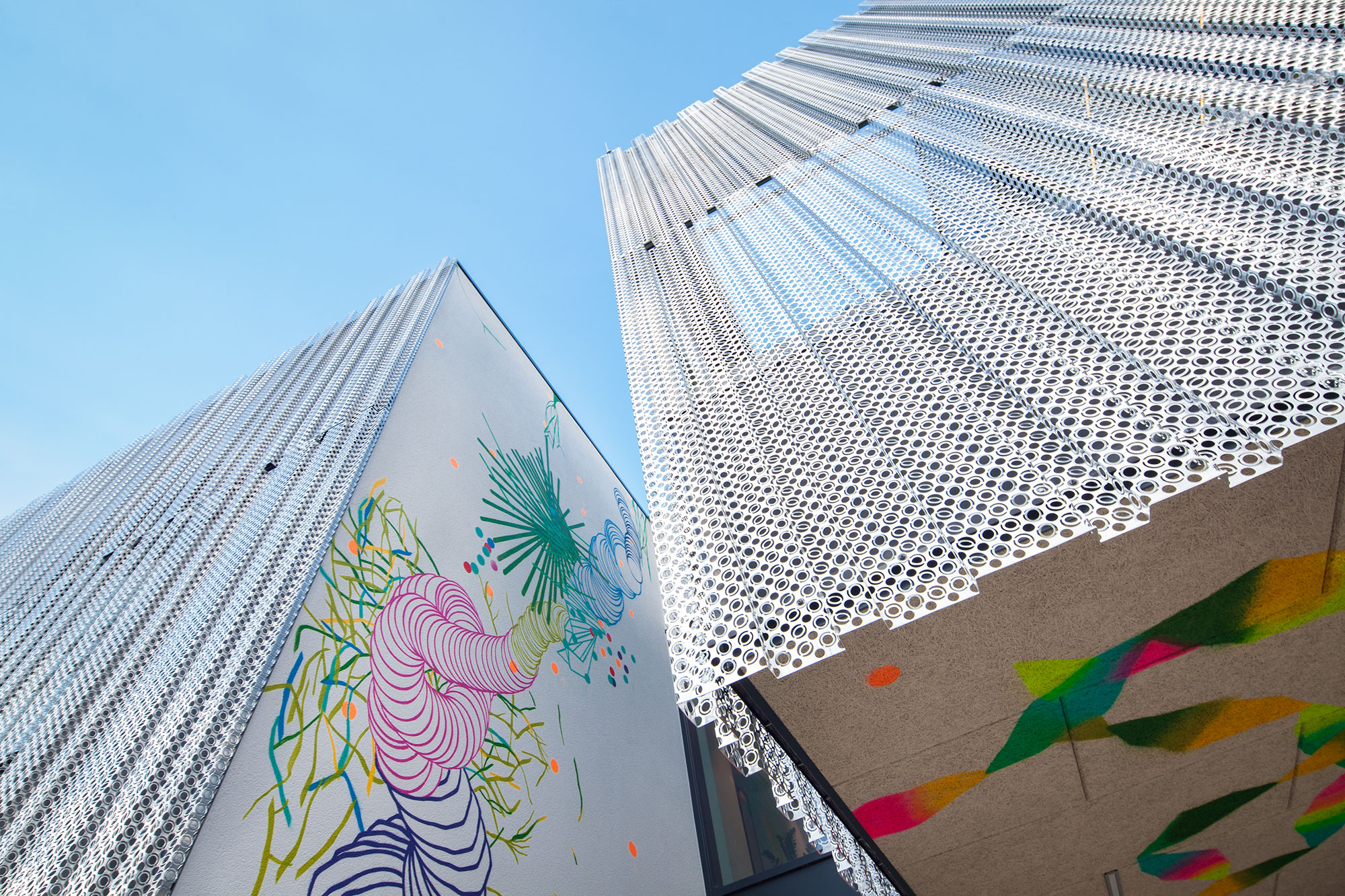 De 2012 a 2017, los diseñadores y arquitectos de Alleva Enzio, así como algunos colaboradores, han ido adecuando de forma gradual los 520 m2 de este espacio que luce hoy un exterior metálico multiperforado que revierte la luz de forma diferente gracias a sus inclinaciones y un interior totalmente artístico del que destaca su escalera multicolor y el vistoso y original mobiliario aportado por la firma belga Sixinch
