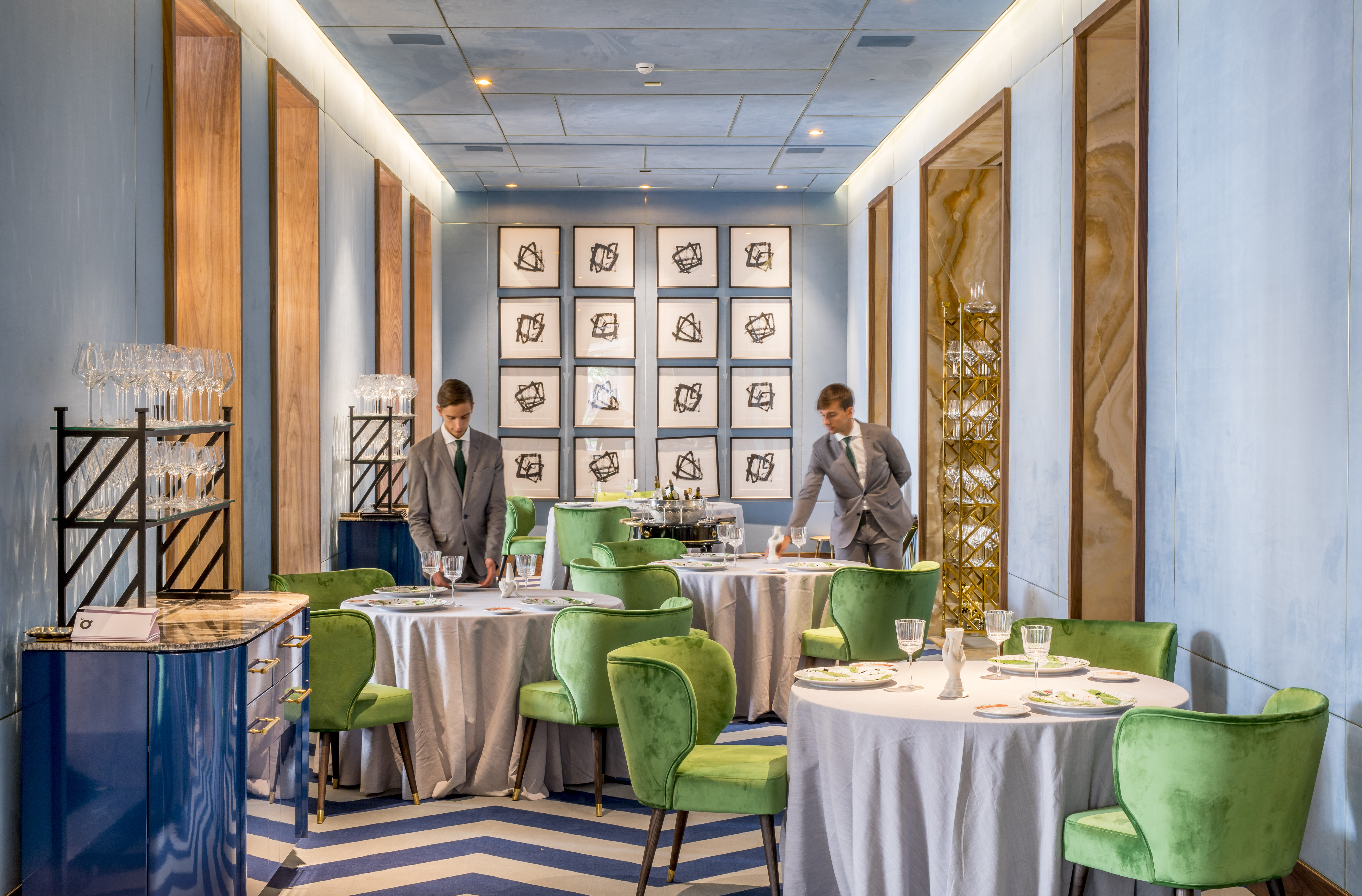 El circuito continúa por la cocina, en la que destacan los artesonados de los techos y el gran mural con peces de inspiración oriental. Y para acabar este paseo de los sentidos, en el salón principal los corocoros nos saludan desde la cúpula. Cuando nos sentamos en las mullidas butacas de color verde, la mirada se dirige hacia el estampado geométrico rojo y blanco de las paredes. Gastronomía y decoración al servicio de los paladares más exigentes.