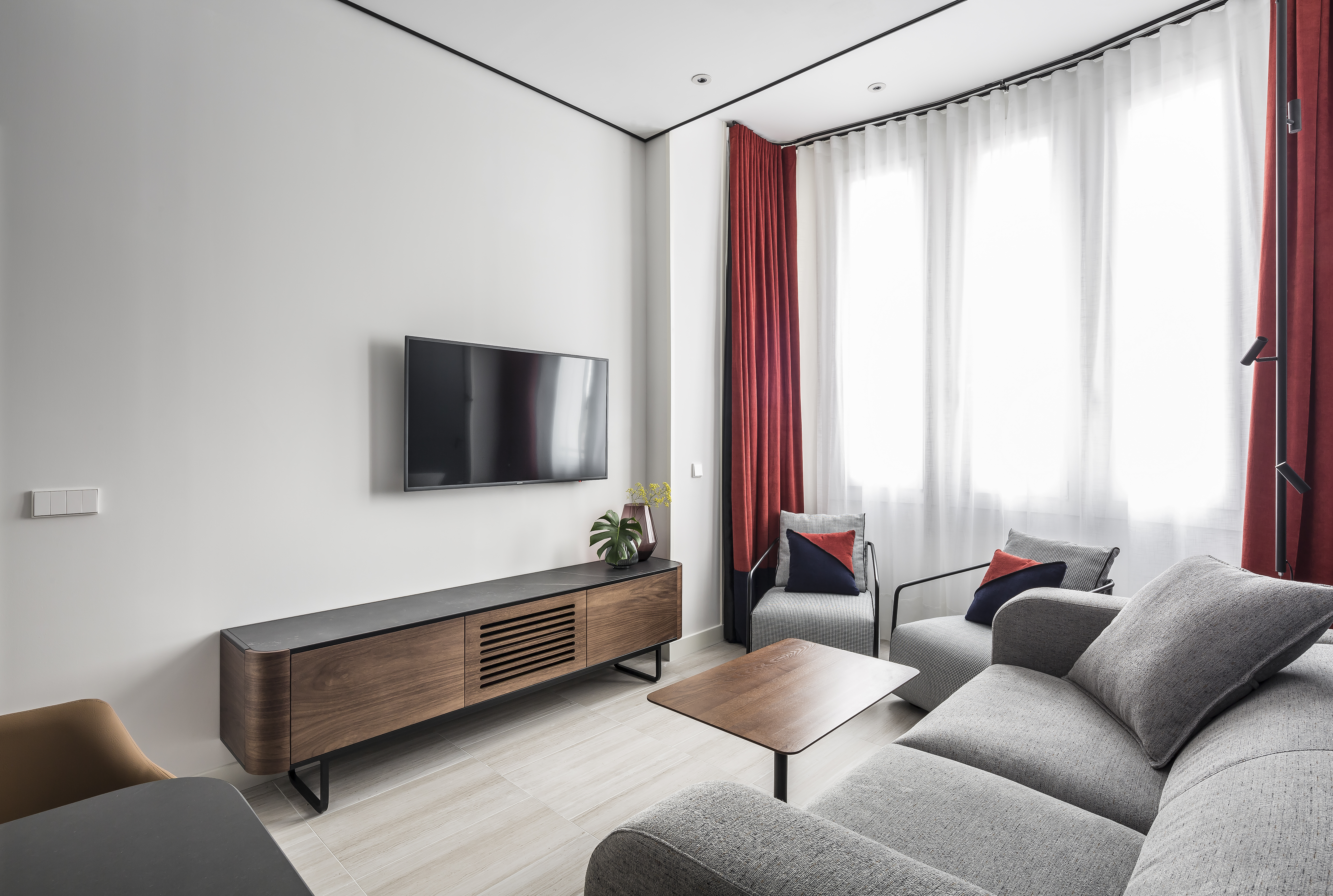 El arquitecto Víctor Duma, junto con Mª José Gómez Martín y Julia Íñiguez, es el responsable del interiorismo de 55 apartamentos turísticos para SmartRental, ubicados en plena Gran Vía madrileña. En ellos prima el toque personal y acogedor, a fin de que los usuarios se sientan como en su propia casa mientras disfrutan de su comodidad y elegancia. Cobran especial relevancia los muebles de la firma valenciana Momocca —como el aparador Adara—, que se han convertido en fuente de inspiración en cada estancia gracias a sus líneas curvas, los acabados en distintos materiales y texturas y los colores, basados en las tonalidades de la madera de nogal. El resultado es un concepto vacacional diferente, que ofrece al visitante una experiencia única en un espacio que rompe con la estética habitual de este tipo de alojamientos.